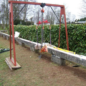 A busy day today. Discussion with Bill and Mark regarding the signal cable runs and the decision to try to make use of original wiring. Bill then measured up for the length of trunking we would need. John filled in the excavation we made last week with frozen turf. Chris and I cut up lengths of DPC to cover the tops of the pillars before the beams were to go back in place. With lots of help the 'A' frame was put together complete with block and tackle and one by one the beams were cleaned of any remaining mortar and hoisted / lowered back in position. The 'A' frame worked very well in making the job safe and manageable.